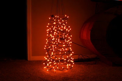 I cleaned off our porch, threw away some tomato plants (finally!) and ended up with 4 cages. I then took a trip to Hobby Lobby..... unsupervised... sorry, B, and found some orange lights.